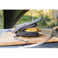 Perfect for cooking around the campsite, the worksite or enjoying hot meals on the go, the Companion Roam Sandwich Grill Press transforms from a sandwich press to a grill plate in seconds, thanks to its 180-degree folding design. Whether you're making toasties or whipping up breakfast, the grill and flat plate combo supports a variety of cooking styles. Dual heating elements ensure even heat distribution across both plates. Cleanup is simple with non-stick cooking surfaces and a built-in oil barrier. The cool-touch handle adds safety while cooking, and the built-in power lights let you know when it’s ready. Best of all, it's safe to use during total fire bans - no open flames, just reliable hot meals wherever you are. Plus, with an Anderson-style connector, you can hook it up to a battery box and enjoy hot snacks wherever your adventure takes you.