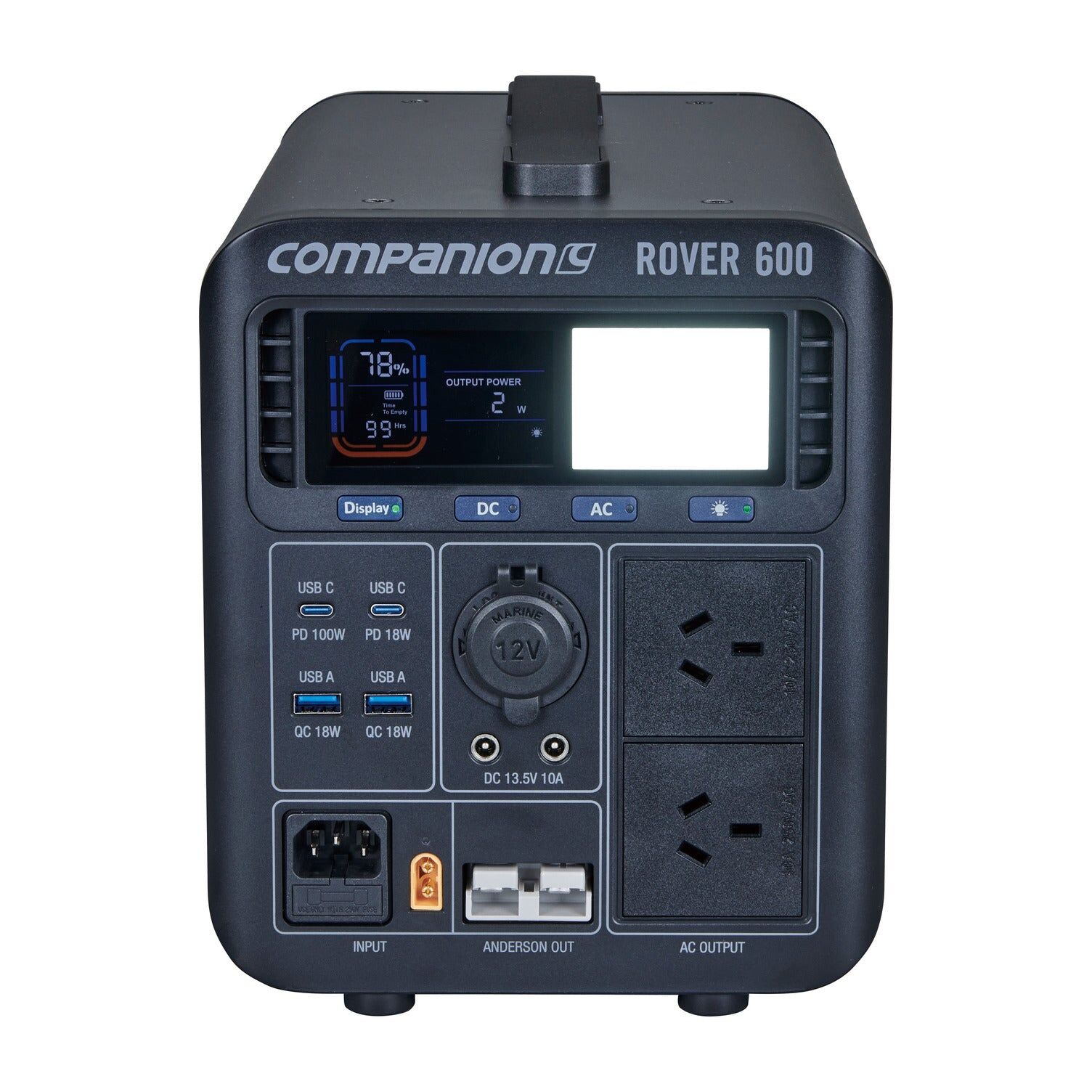 Designed for convenience and versatility, the Rover 600 offers multiple output charging options, including a 12V socket, USB-A/USB-C ports, Anderson, and DC output, catering to a wide range of devices. With the built-in MPPT Controller, harness the power of the sun with up to 350W of direct solar charging. The fast-charging capability allows you to recharge the unit from 0 to 100% in just 2 hours via a 240V AC outlet. The sleek and robust housing not only provides durability but also features a user-friendly interface with a full colour LED display showing battery capacity, run time, and wattage. With its advanced battery management system, the Rover 600 is the perfect companion for your next camping trip or travel adventure.