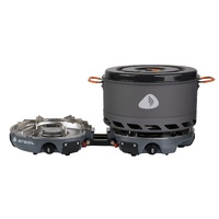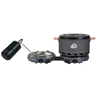 The Genesis Basecamp System is the ultimate all-in-one outback cooking system, stowing neatly into itself and fitting snugly among your gear. The system's 5-liter Jetboil FluxPot and 10-inch ceramic-coated nonstick fry pan give you everything you need to set a new benchmark for basecamp cooking. A beastly 10,000 BTU heating system boils water in just over three minutes. An attachable windscreen improves the system's performance in any weather; regulated for consistent performance down to -6 degrees C. Includes system carrying bag with pocket for regulator fuel connection; compatible with standard 16.4-ounce propane bottle; weighs 4.1 kg.