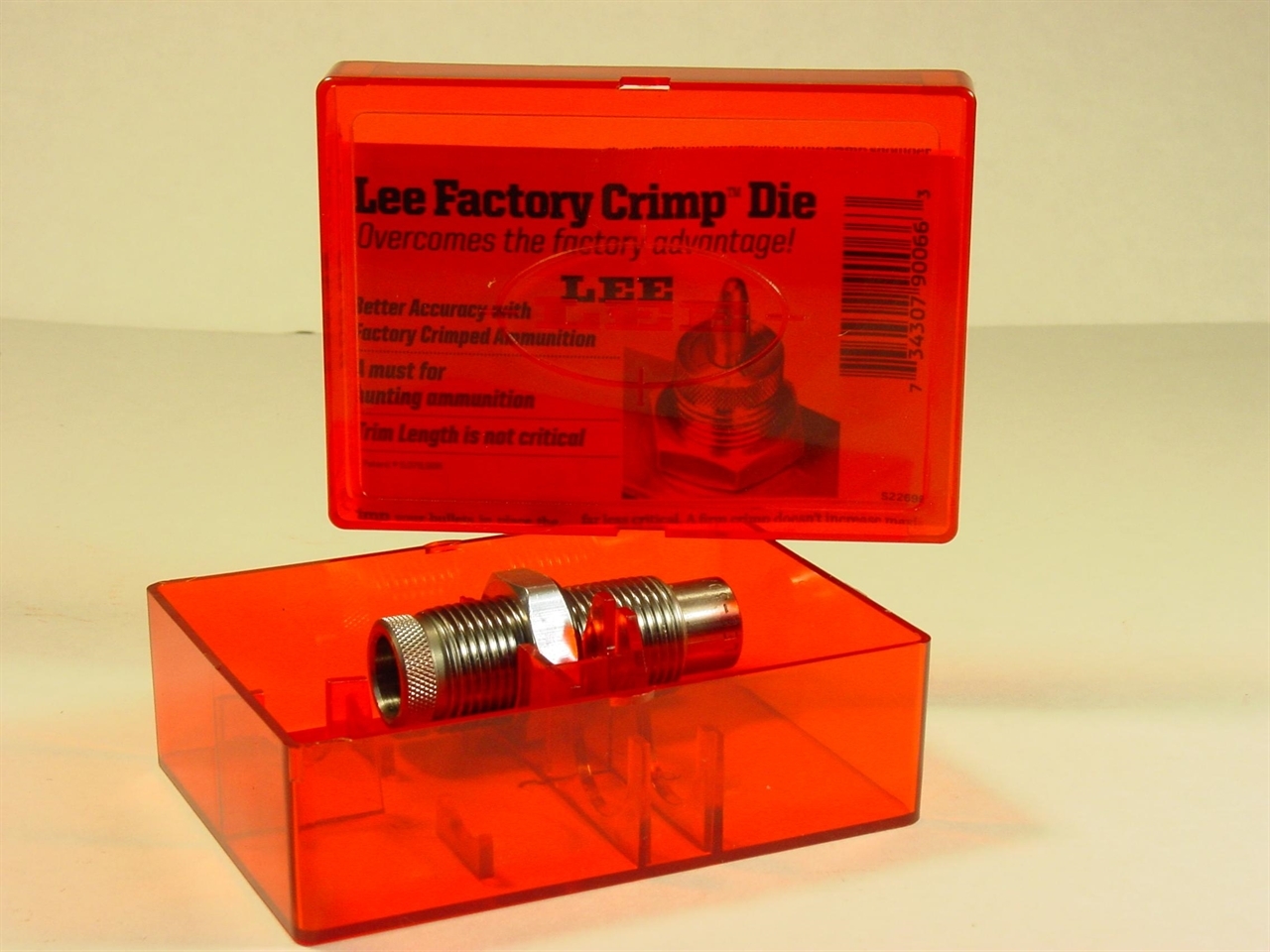 Lee 375 WIN Factory Crimp Die crimps the bullet in place more firmly than any other tool. Tests demonstrate that even bullets which have no crimp groove will shoot more accurately. A firm crimp improves accuracy because pressure must build to a higher level before the bullet begins to move. This higher start pressure insures a more uniform pressure curve and less velocity variation.