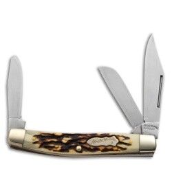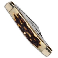 This Uncle Henry classic Rancher pocket knife is an American tradition. Often found in many of our grandfather pockets, this folding knife features satin finished stainless steel clip point and sheepsfoot blades on one end and a pen blade on the other end with slip joint construction. The canoe-shaped handle features Staglon scales, brass liners, polished nickel silver bolsters, and brass rivet construction.